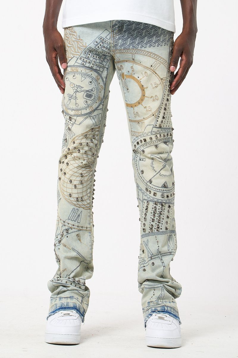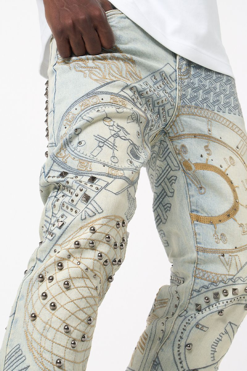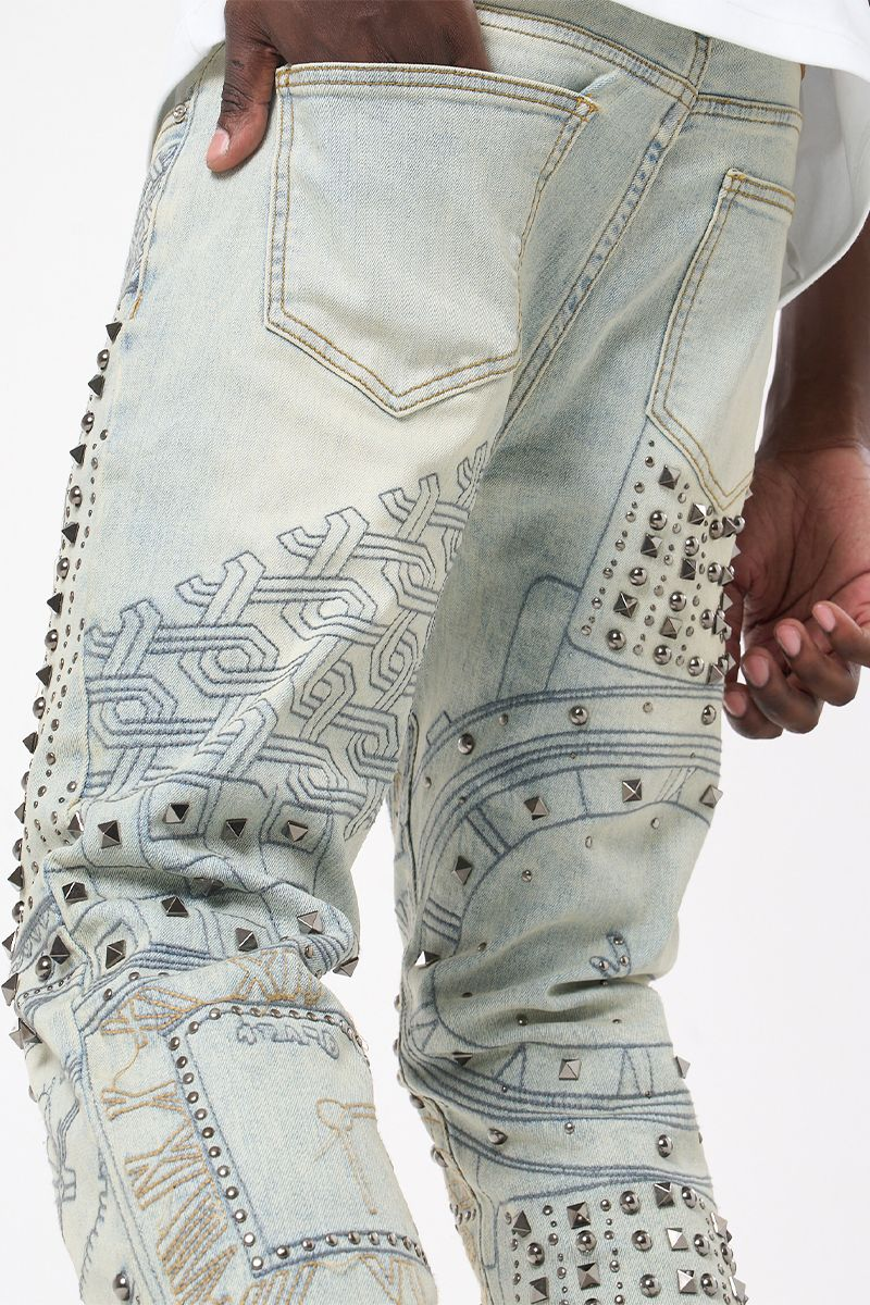 Available in antique blue or jet black, this standout jean features all-over embroidered detailing and bold studded arrangements. A statement piece with edge, built for the spotlight.